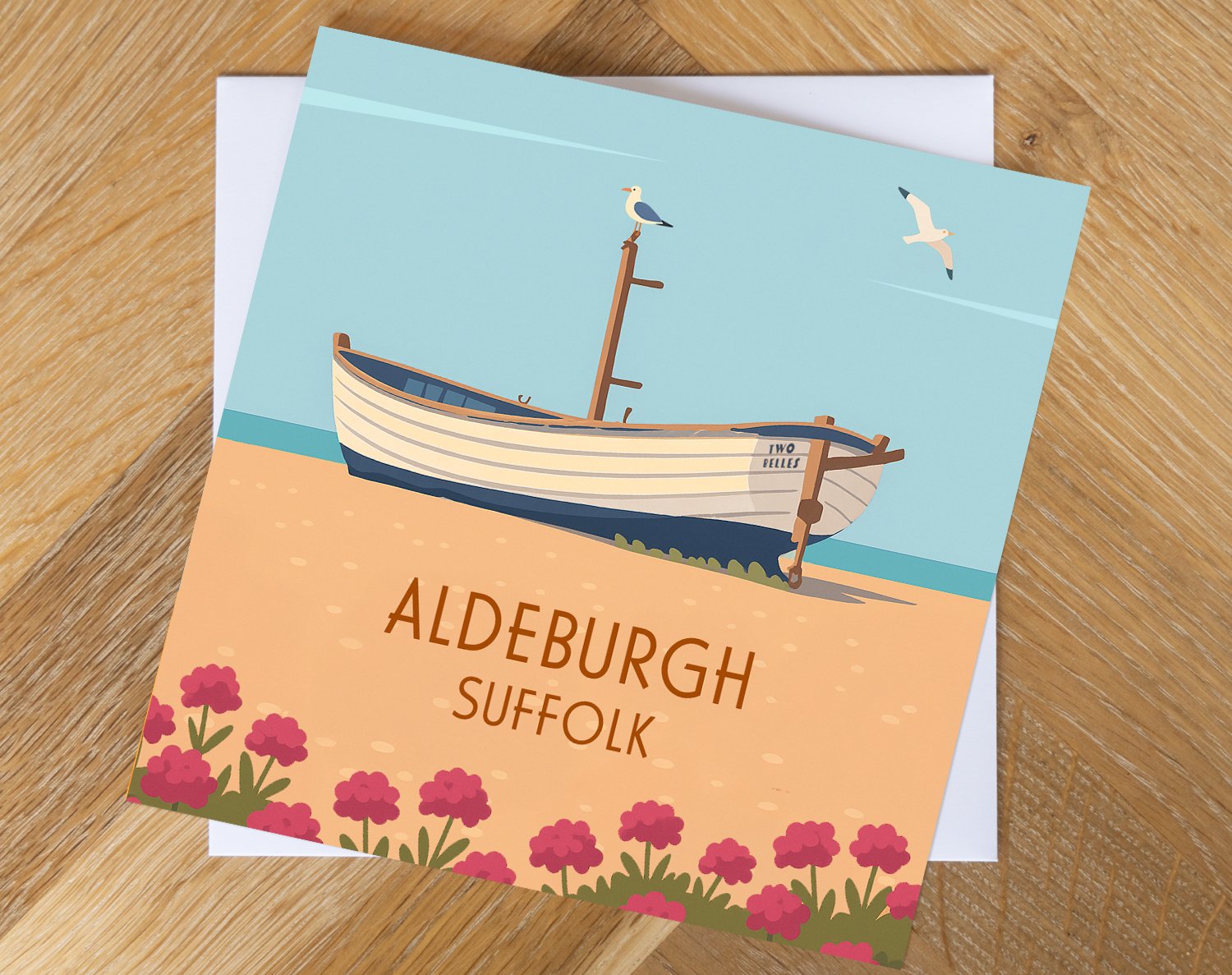 A greeting card featuring a digital illustration with a retro vintage look, created from a photograph of the Two Belles fishing boat on Aldeburgh beach, taken by David Calvert.